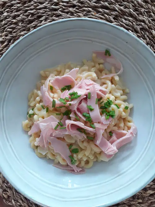 Alors vous allez me dire des pâtes au jambon, rien de bien sorcier, tout le monde connaît, c’est un classique. Mais alors cuites de cette manière, personnellement, je n’avais jamais testé.